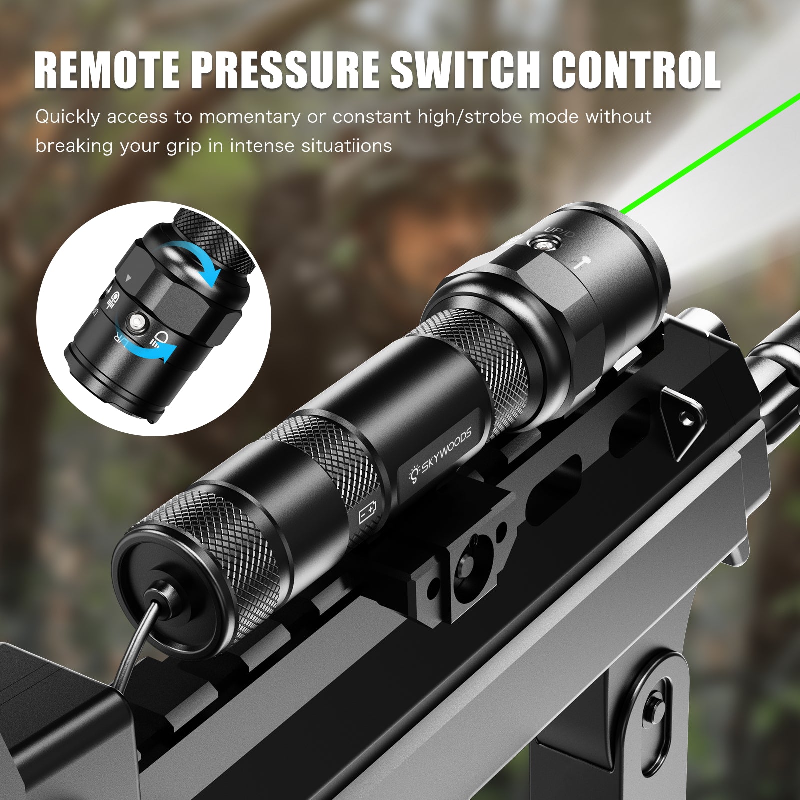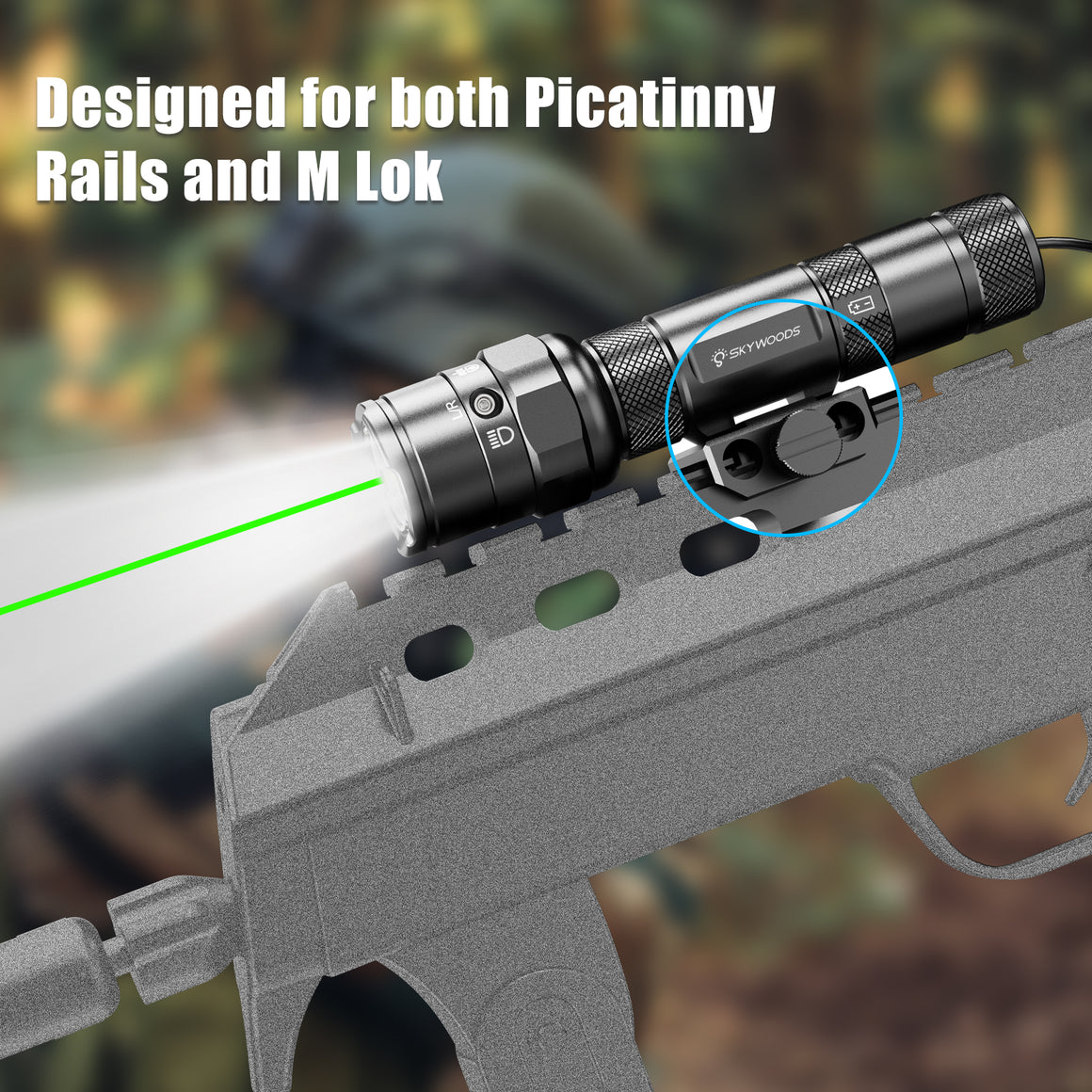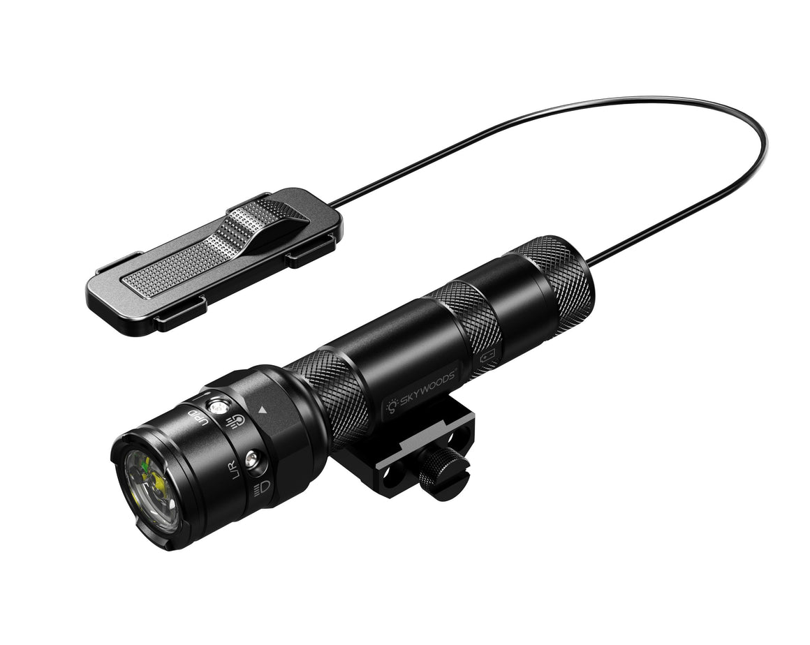 The Skywoods RL900G is a rifle-mounted tactical light with integrated green laser, designed for authorised defence, military, and government users requiring combined illumination and aiming capability. Delivering up to 900 lumens of white light with a beam distance of 150 metres, the RL900G supports effective target identification in low-light and close- to mid-range operational environments.