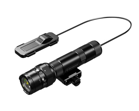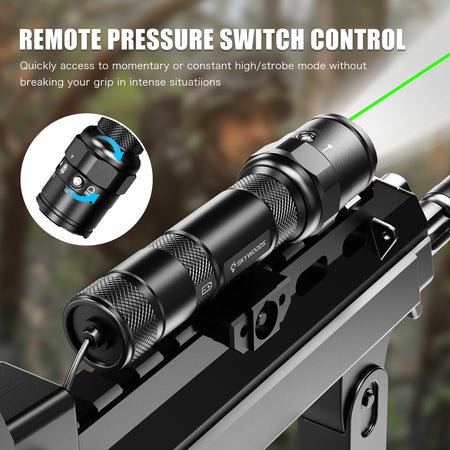 The unit features a front rotary selector allowing rapid switching between white light, green laser, or combined light and laser modes. Dual switching options, including a tail switch and remote pressure switch, provide flexible activation to suit different weapon handling and operational requirements. Housed in a robust aluminium body and rated to IP66 waterproof, the RL900G is built for professional field use.