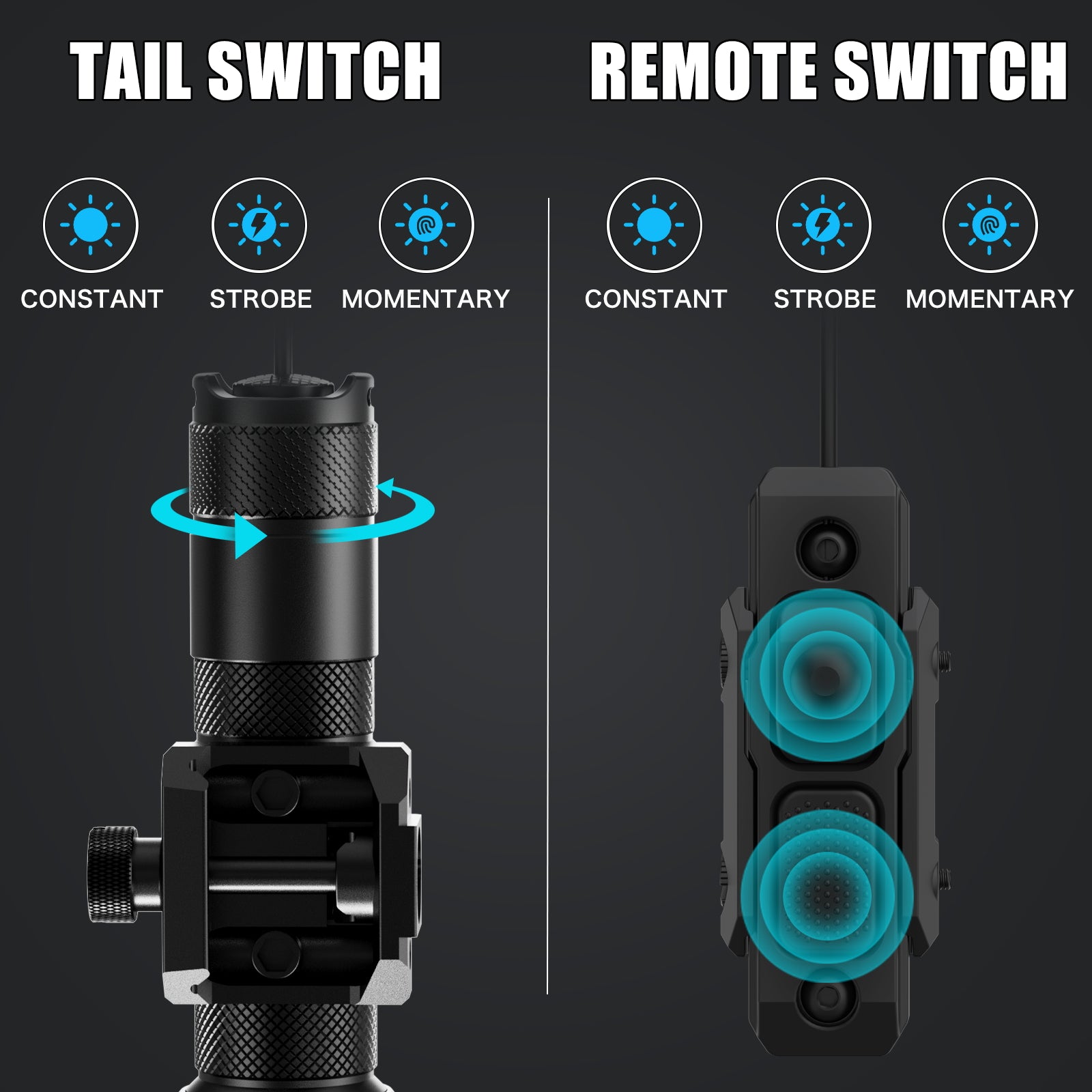 Dual switching options: tail switch and remote pressure switch